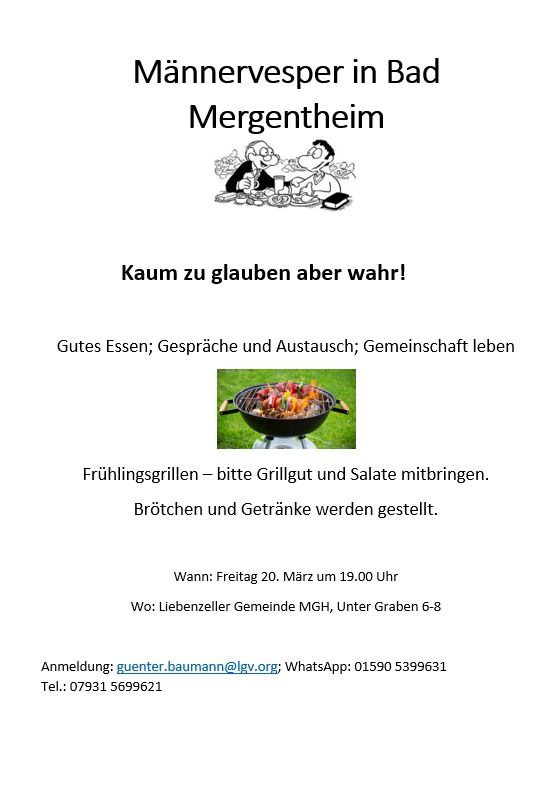 es ist erfreulich, dass wir mit so vielen bekannten und eingeladenen Gesichtern unsere Männerarbeit durchführen können. Normalerweise lassen wir uns in dem Männervesper das Gemüse vom Tier gut schmecken. Ja, Essen ist immer ein schöner geselliger Anteil unserer Männervesper, aber auch die geistlichen Impulse gehören jedes Mal dazu und regen zum Gespräch im Anschluss an. Es sind alle Männer herzlich zu unseren nächsten Treffen eingeladen und wir freuen uns natürlich auf jedes neue Gesicht!